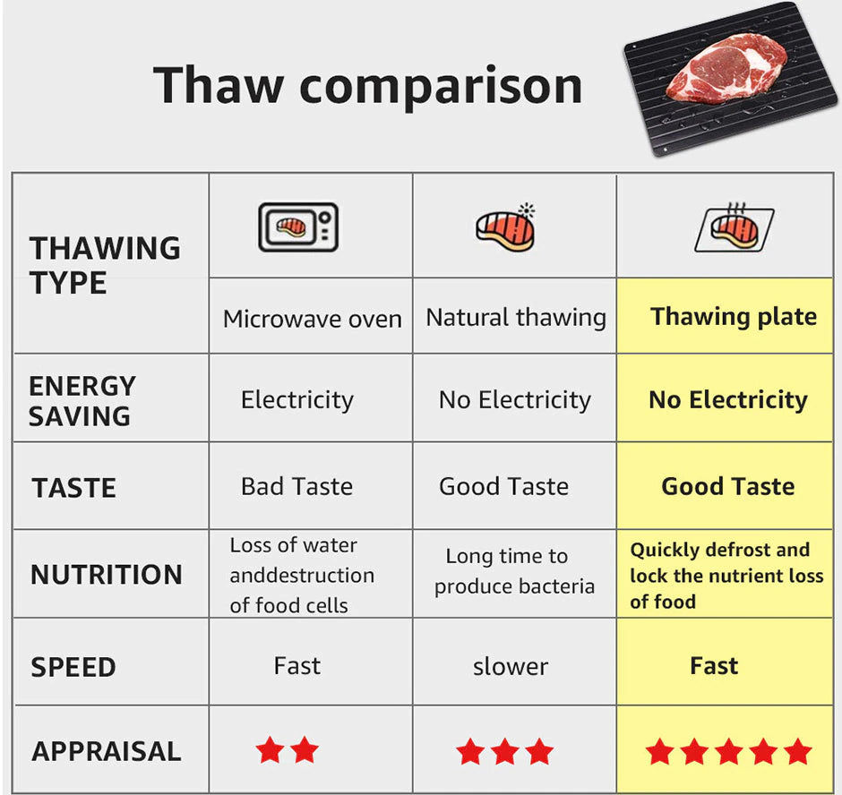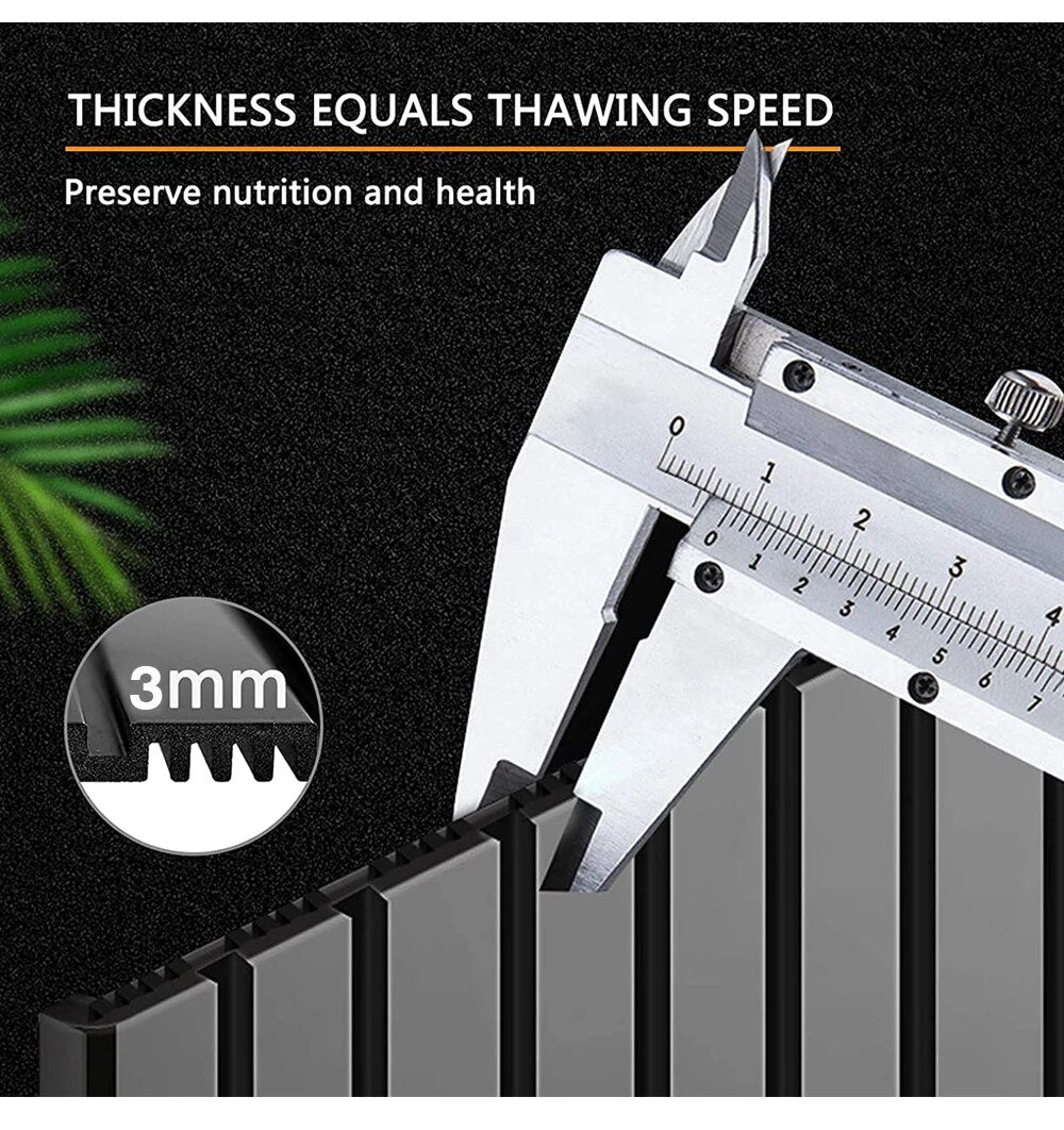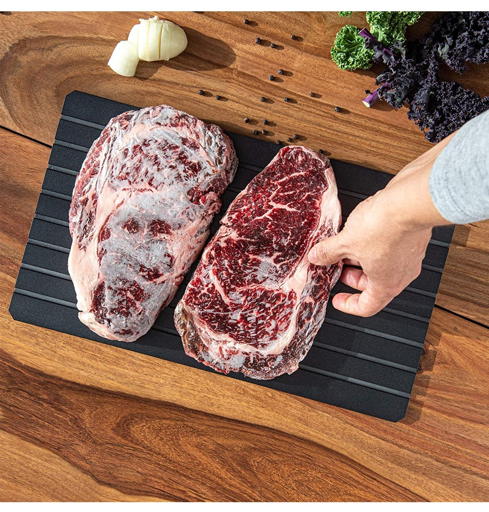 De Snelle Ontdooiingsplaat is gemaakt van hoogwaardig thermisch geleidende aluminium om het ontdooiproces te versnellen, de ontdooisnelheid is 8 keer sneller dan bij kamertemperatuur. U hoeft zich niet langer af te vragen hoe u uw voedsel binnen enkele minuten kunt ontdooien! Imperial Home Snelle Ontdooiingsplaat laat u uw bevroren vlees of voedsel snel en natuurlijk ontdooien. U hoeft uw bevroren vlees niet in de magnetron te ontdooien, plaats het gewoon op de super ontdooiplaat en zie het magische effect.
