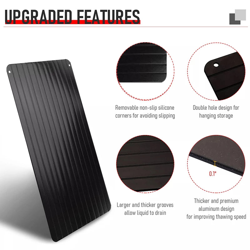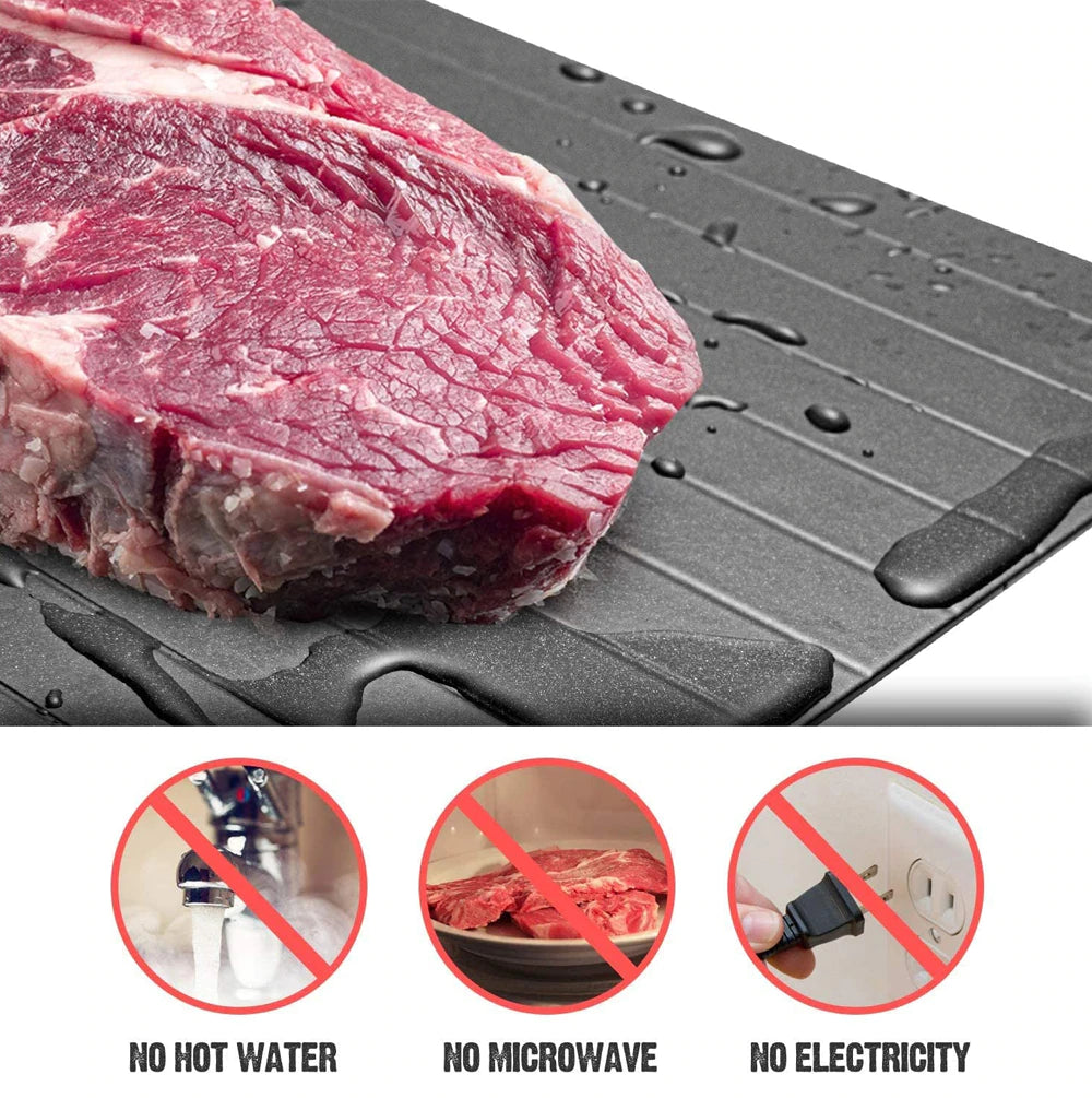 Deze Super Ontdooiplaat is gemaakt van hoogwaardig thermisch geleidende materialen om het ontdooiproces aanzienlijk te versnellen. De plaat heeft geen elektriciteit of batterijen nodig. Het ontdooit bevroren producten op natuurlijke wijze. De afmetingen van de plaat zijn 14 inch lang en 8 inch breed. De veiligste manier om vlees of bevroren voedsel snel en natuurlijk te ontdooien.