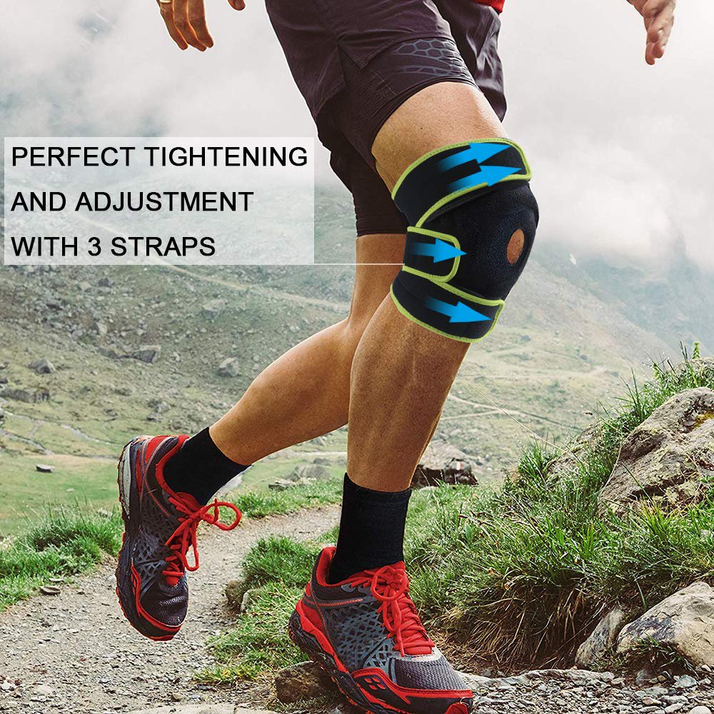 Mountaineering Antislip Kniebeschermers zijn gemaakt van hoogwaardige stoffen, die duurzaam, zacht en comfortabel zijn. Haak- en lusontwerp, pas de strakheid aan volgens je eigen behoeften. Driedimensionaal weven, voorkomt beenvermoeidheid en zorgt voor een gezondere training. De spanning op de banden kan worden aangepast door de banden die van de interne steun komen en de spanning op de buitenste wikkel zelf aan te passen.